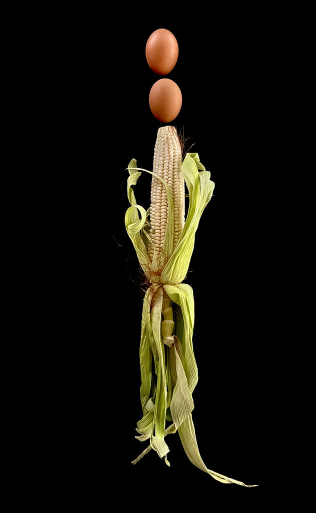 Using play and reflection, Katusha dives into duality of two simple yet profound objects — Corn and Eggs. At the heart of this collection lies an exploration of development of healthy masculinity the world is slowly learning. Stepping into this ethereal realm, the delicate interplay between Corn and Eggs assumes a metaphorical representation, questioning the essence of modern masculinity. The artist brings up the very fabric of power vs. force. Does size truly dictate strength, or can we cultivate a culture of collaboration and mutual support, where masculine and feminine energies harmoniously coexist?